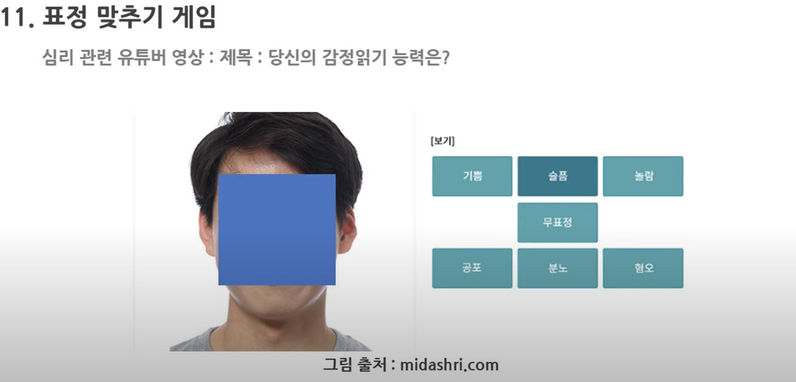 표정 맞히기 게임이란, 말 그대로 사진을 보고 이 사람이 무슨 감정인지 맞추면 되는 게임입니다.
