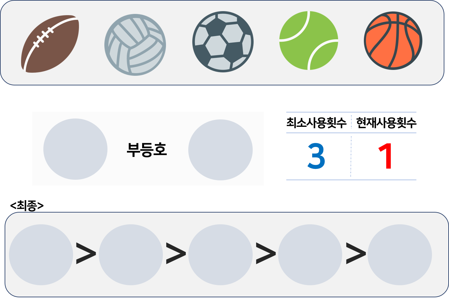 -> 농구공> 축구공, 축구공 > 배구공 등의 사실로 농구공 > 배구공 같은 사실을 파악하여 횟수를 최소화!