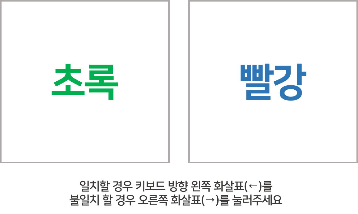 왼쪽 단어의 '의미'(초록) ≠ 오른쪽 단어의 '색상'(파랑)