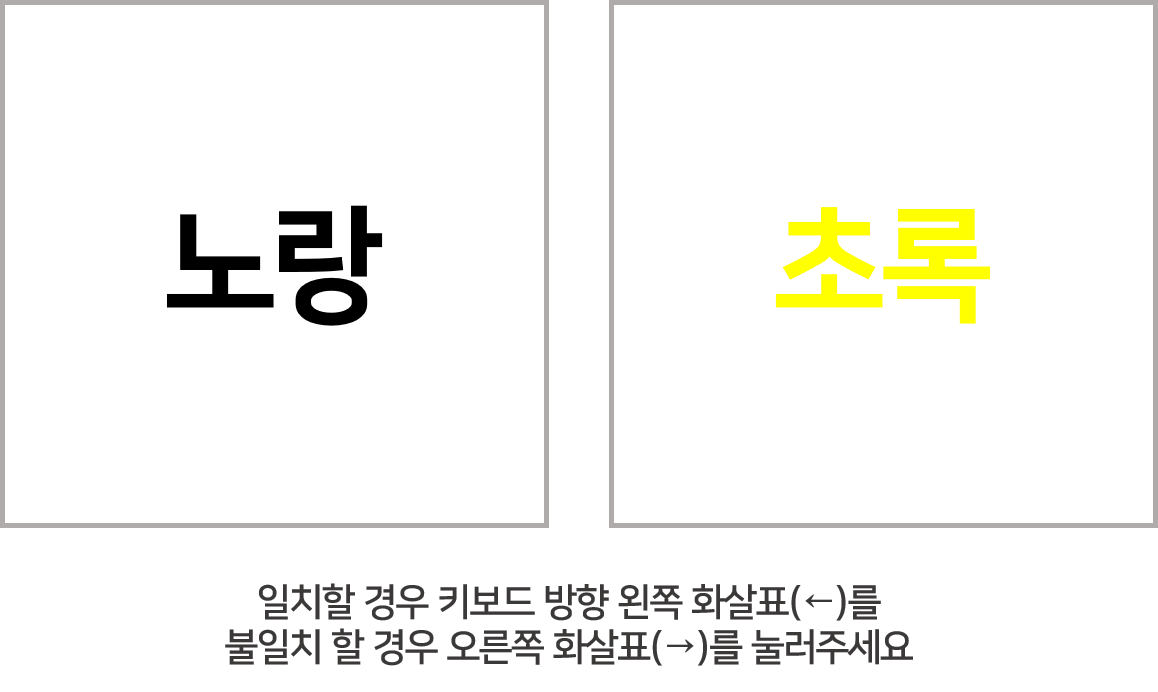 왼쪽 단어의 '의미'(노랑)와 오른쪽 단어의 '색상'(노랑)