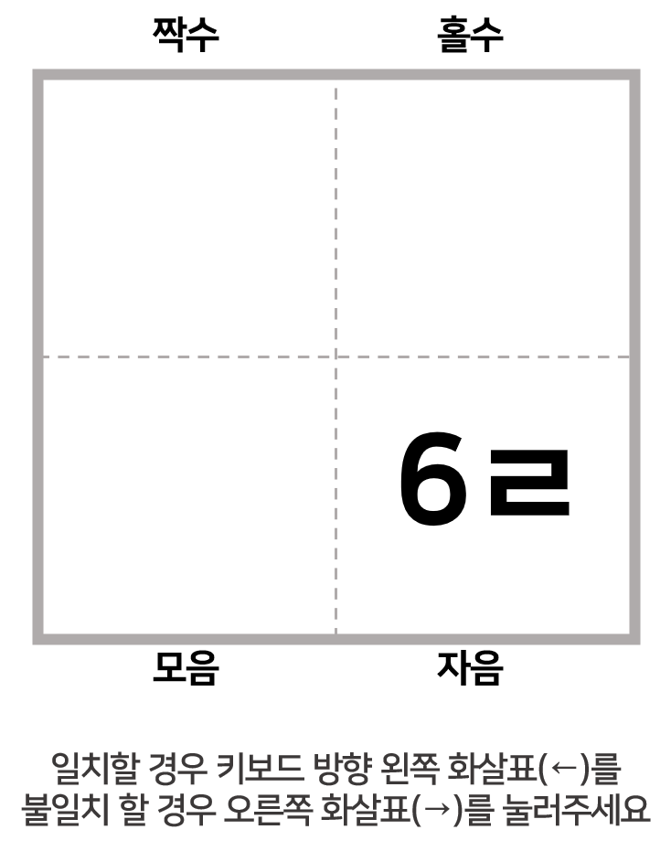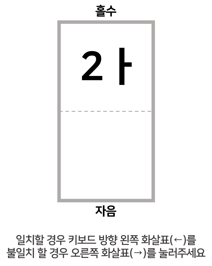 글자 윗부분은 홀수라고 적혀있고 밑에는 자음이라고 적혀있습니다. 그러나 2 ㅏ 는 윗부분에 있기 때문에 '홀수' 라고 적힌 곳에 집중해서 보시면 됩니다. 숫자 2는 홀수가 아니죠? 그러니까 불일치합니다. 이때는 ㅏ는 신경쓰실 필요가 없습니다.